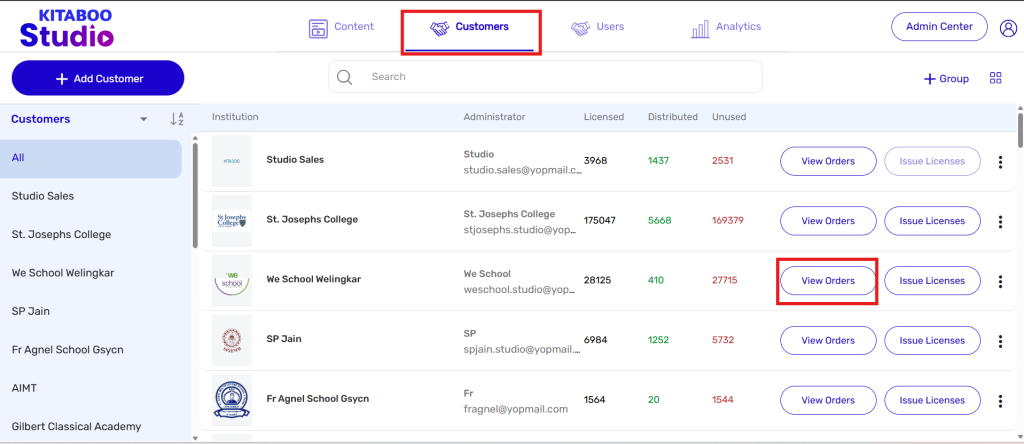 Click View Orders next to the respective customer.