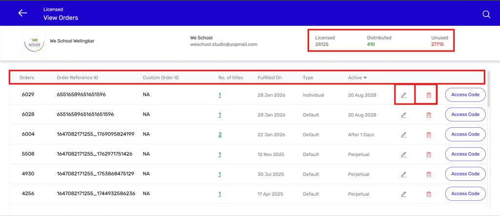 The View Orders section allows administrators to track and manage all license orders issued to customers. From this page, you can review order details, monitor license distribution, and perform actions such as editing or deleting an order, as well as generating access codes.